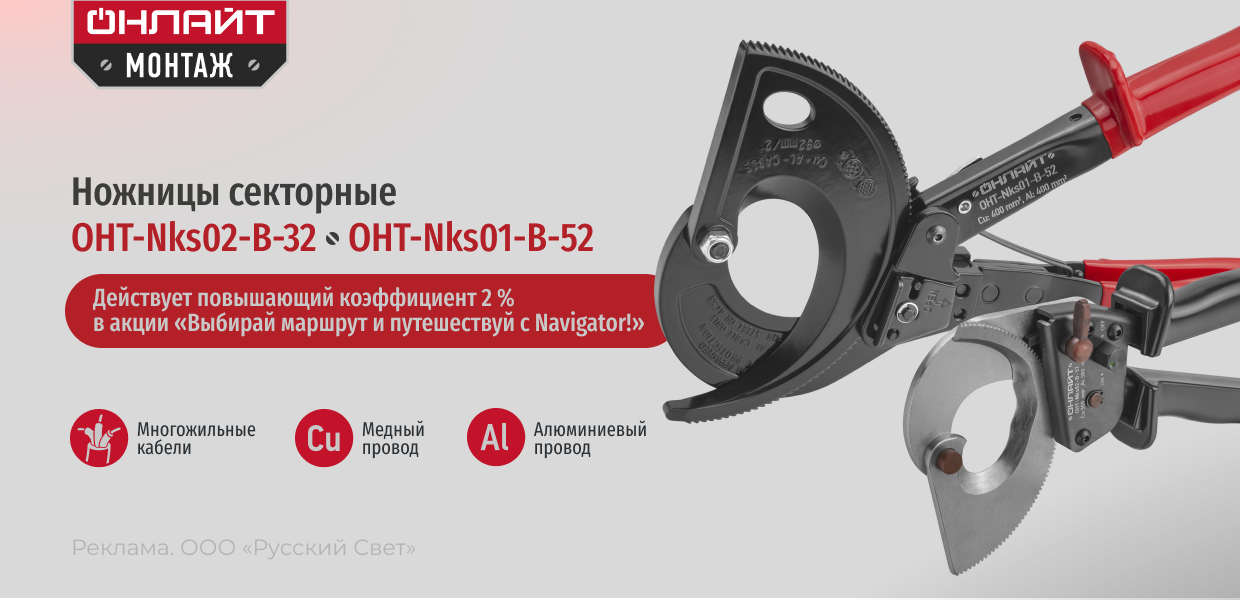 Секторные ножницы ОНЛАЙТ Монтаж серии OHT-Nks01-B-52 с храповым механизмом разработаны для резки силовых бронированных кабелей и проводов с медными и алюминиевыми жилами, а также телефонного кабеля до 3600 пар.
